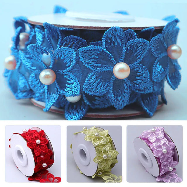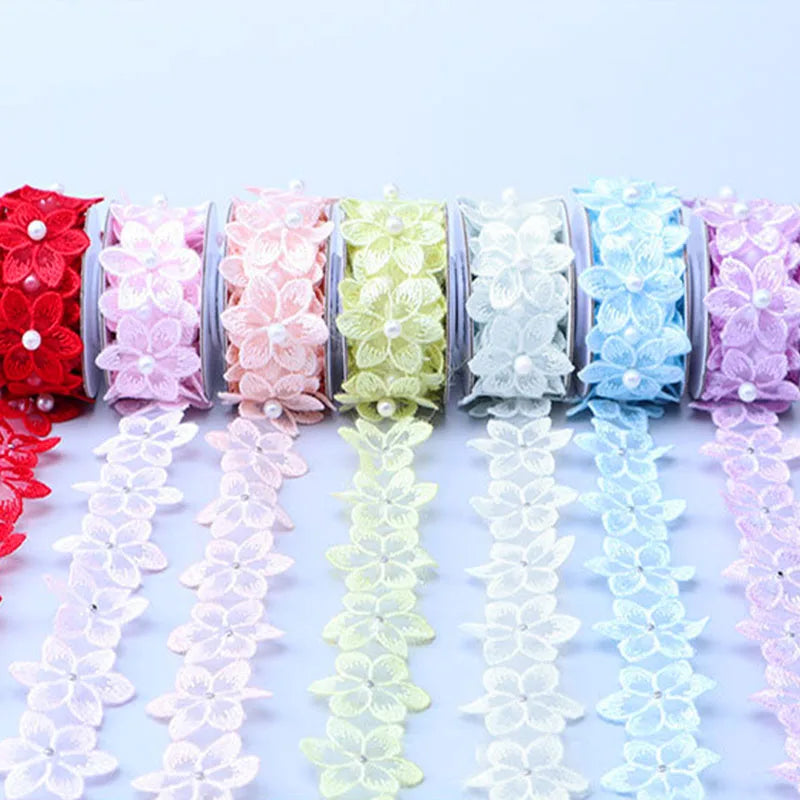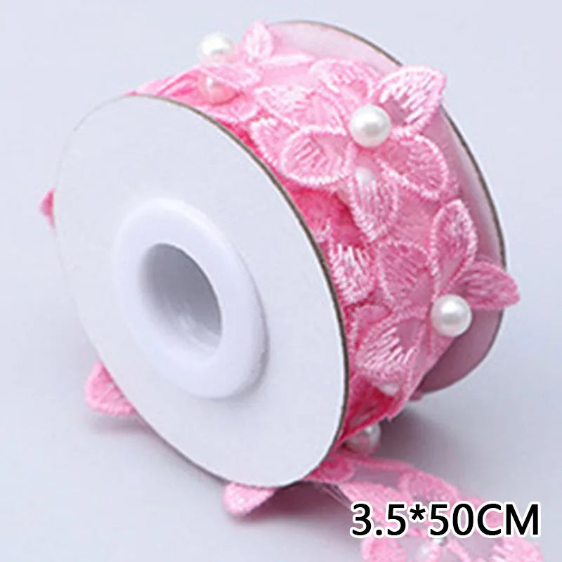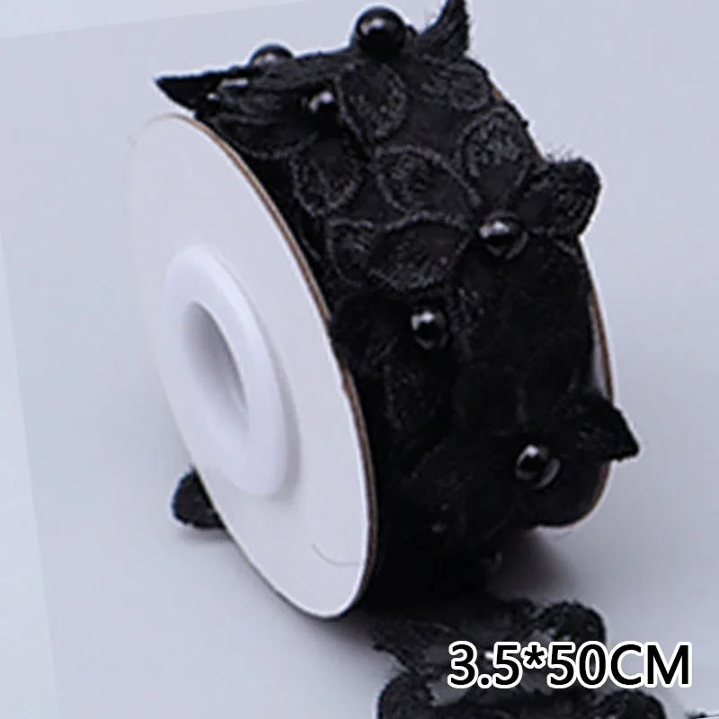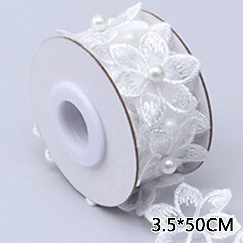 3.5x50cm Embroidered Flower Lace Ribbon Pearl Beaded Fringe Lace Fabric Trim Ribbons Handmade Wedding Dress DIY Sewing Supplies
