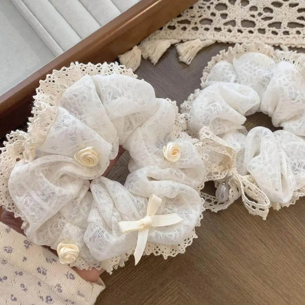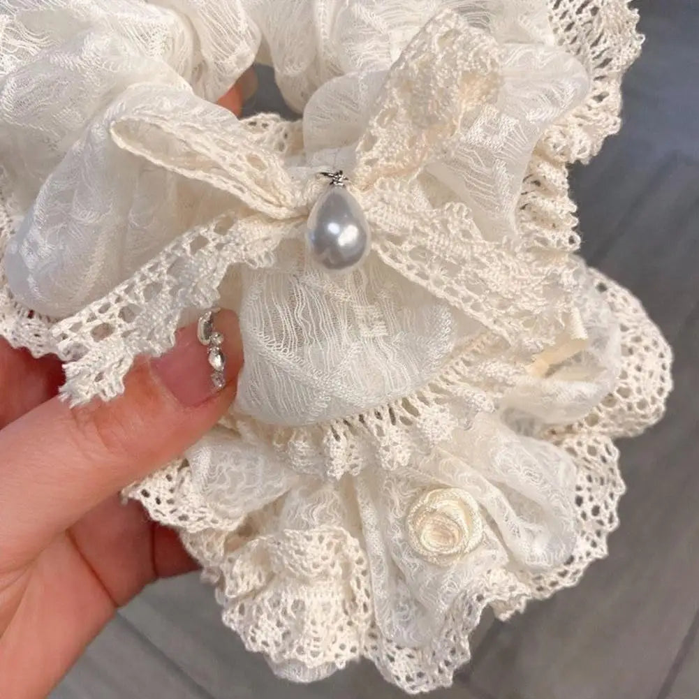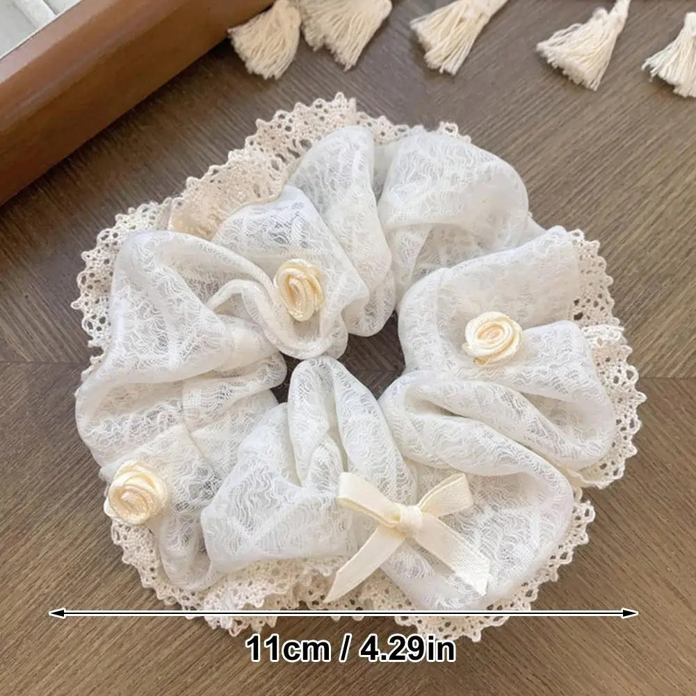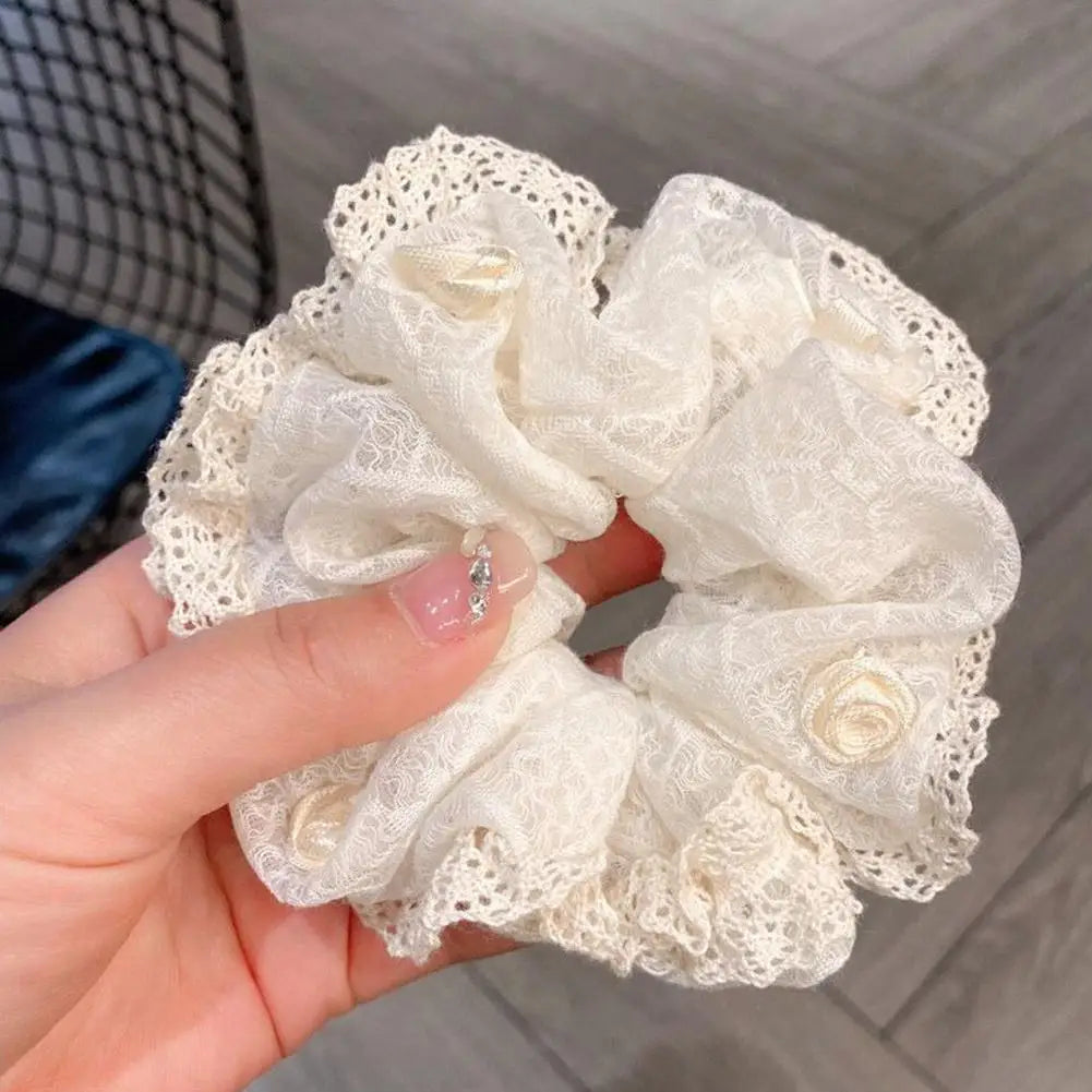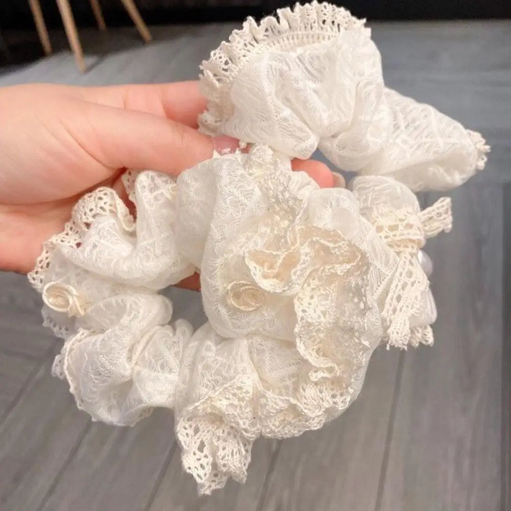 French Lace Pearl Rose Flower Elastics Hair Band For Women Cream White Scrunchies Hair Ties Ponytail Holder Hair Accessories