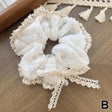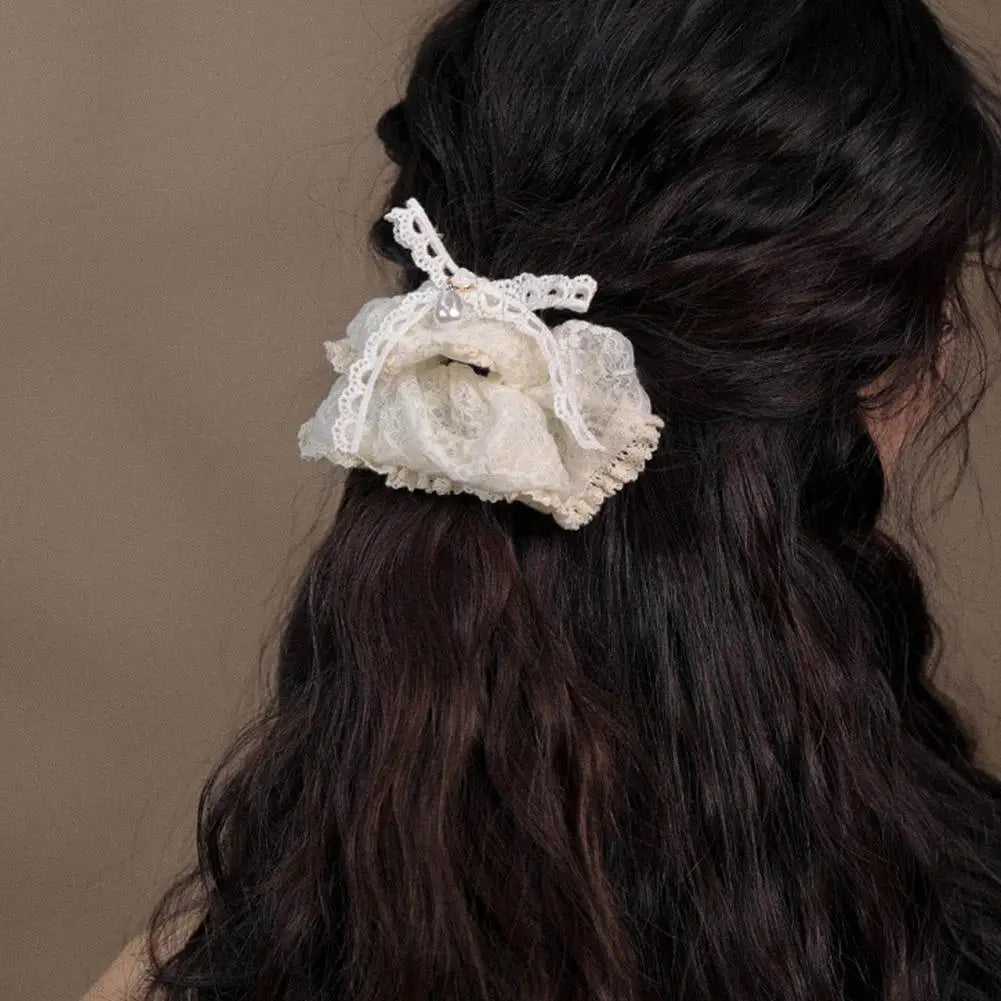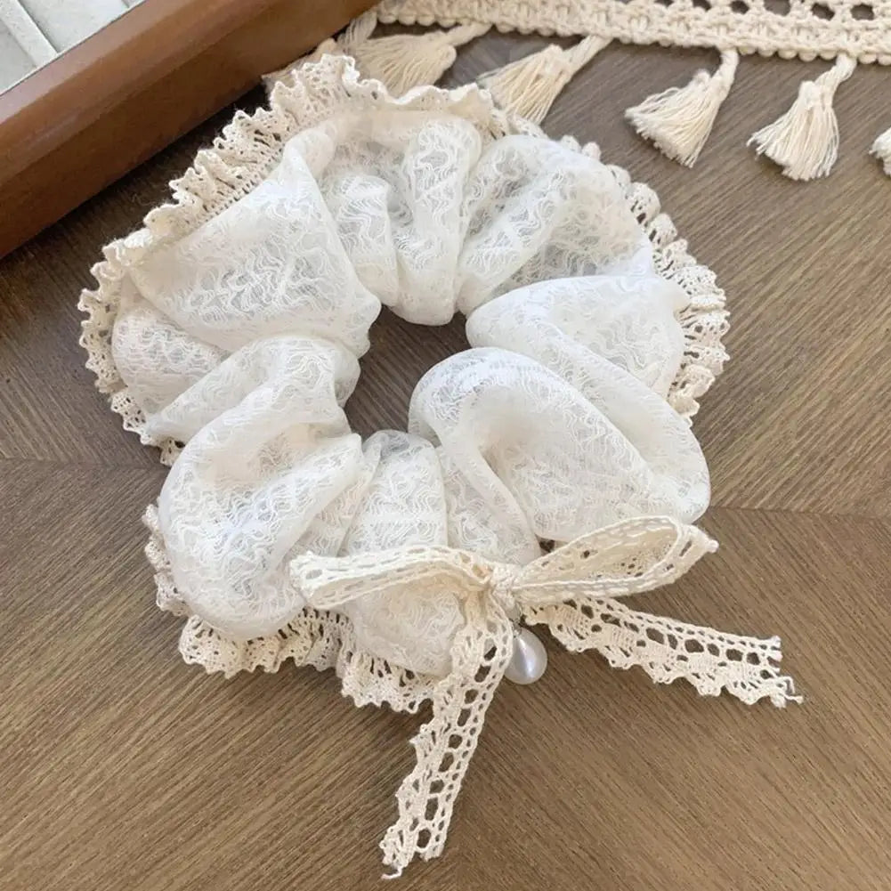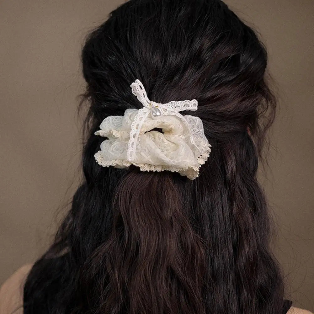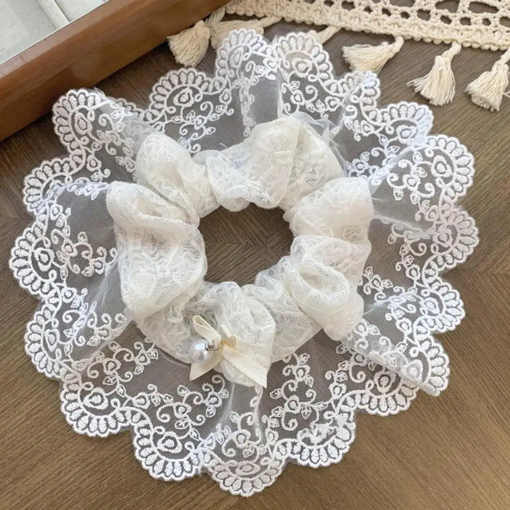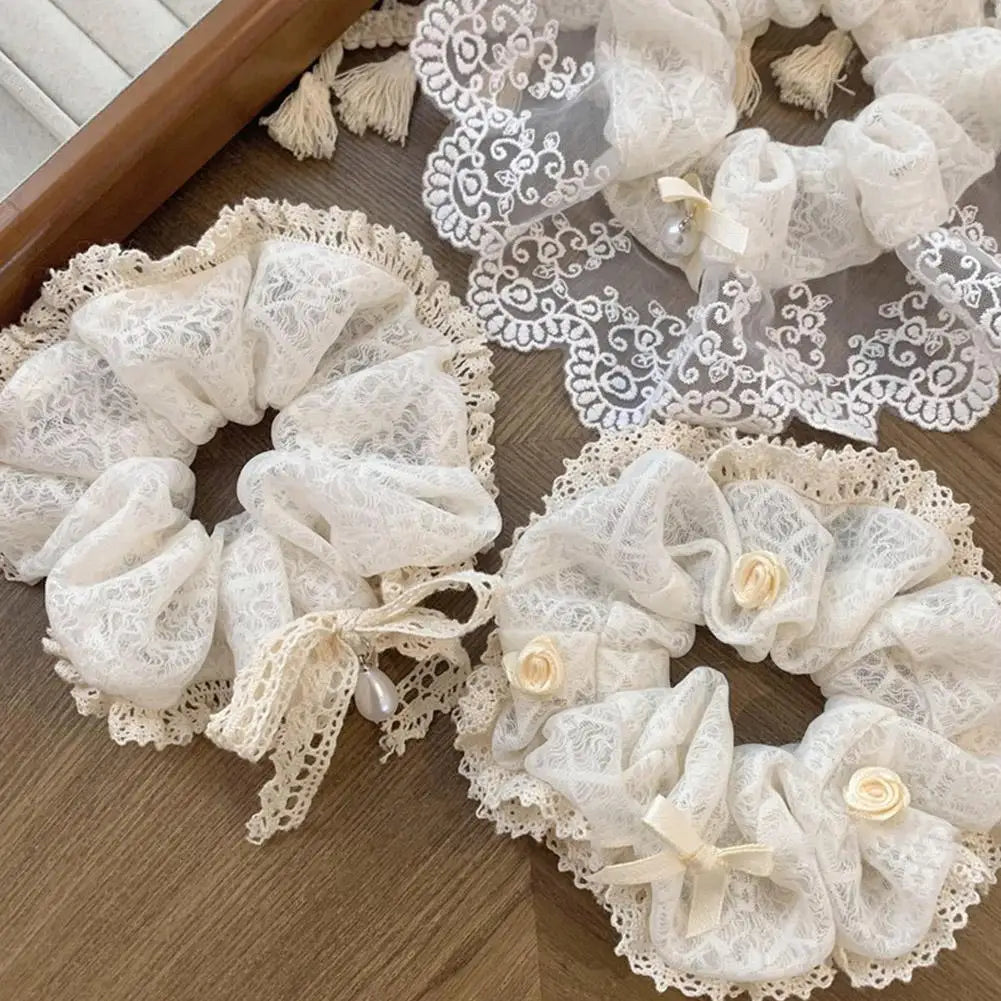 French Lace Pearl Rose Flower Elastics Hair Band For Women Cream White Scrunchies Hair Ties Ponytail Holder Hair Accessories