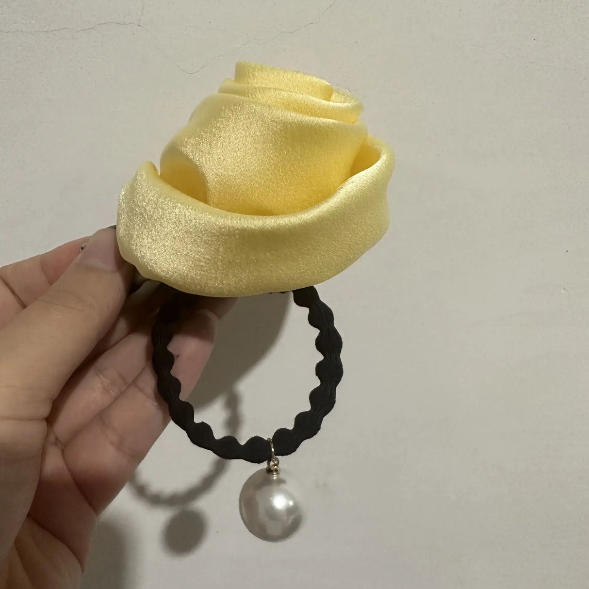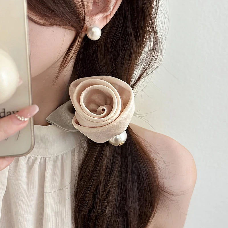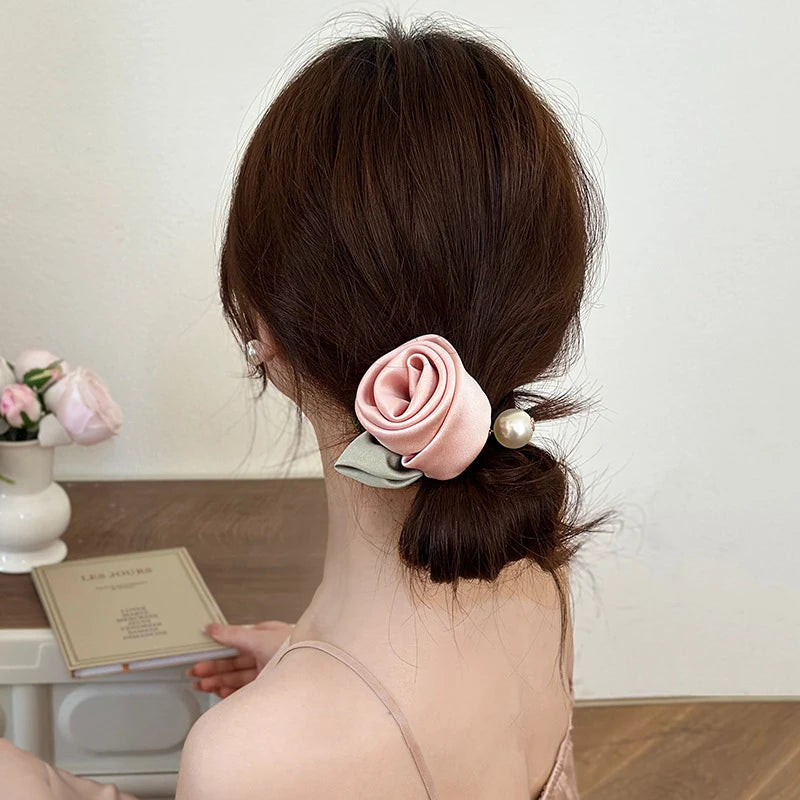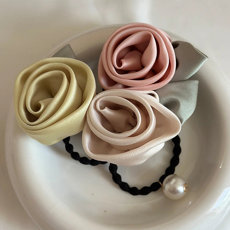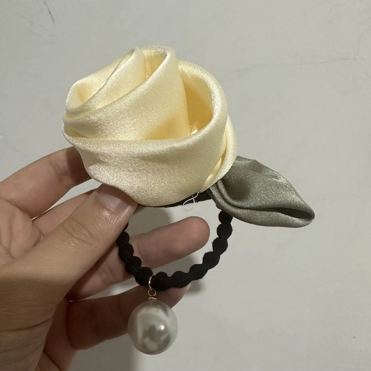 Women Elegant Silk Rose Flower Pearl Elastics Hair Band Beatiful Scrunchies Hair Ties Ladies Ponytail Holder Hair Accessories