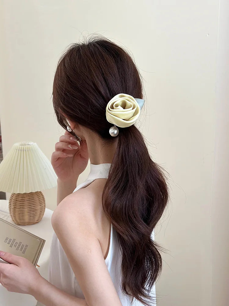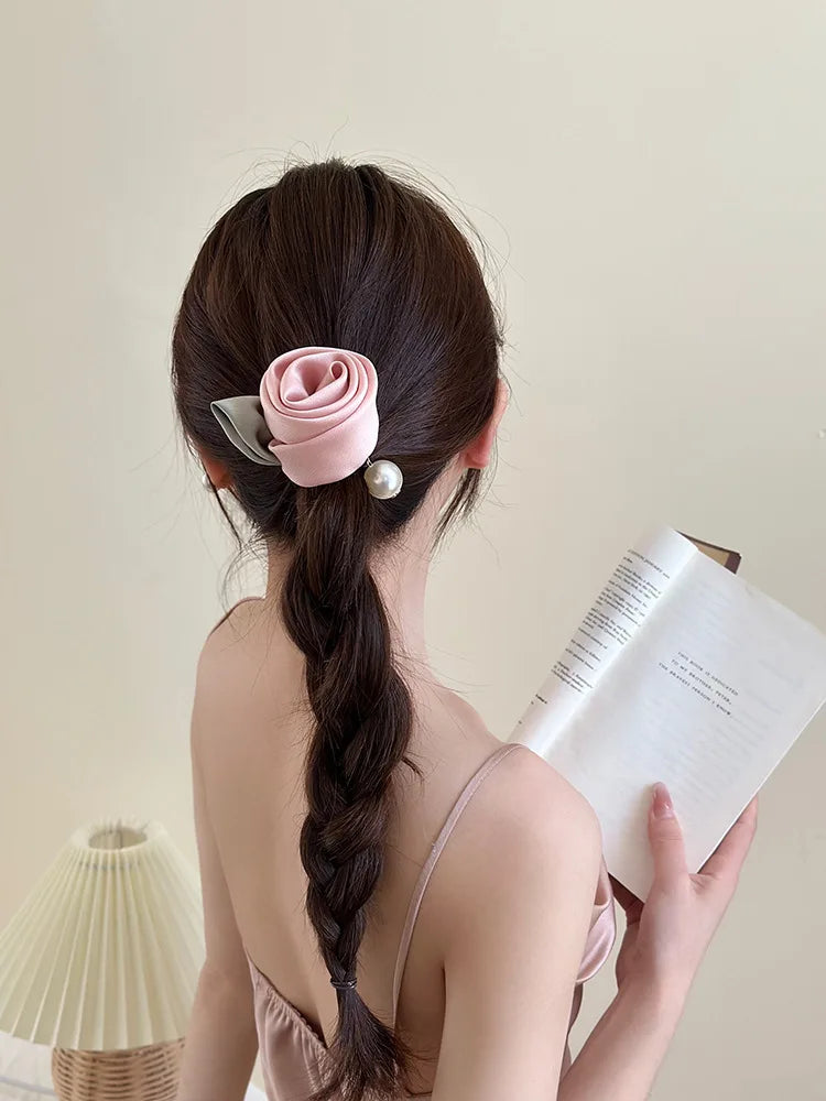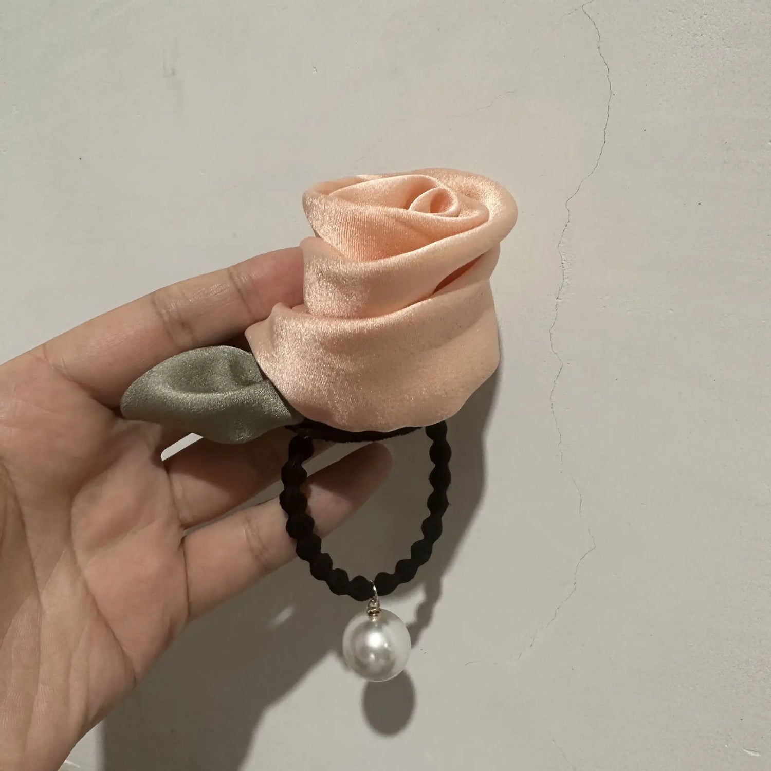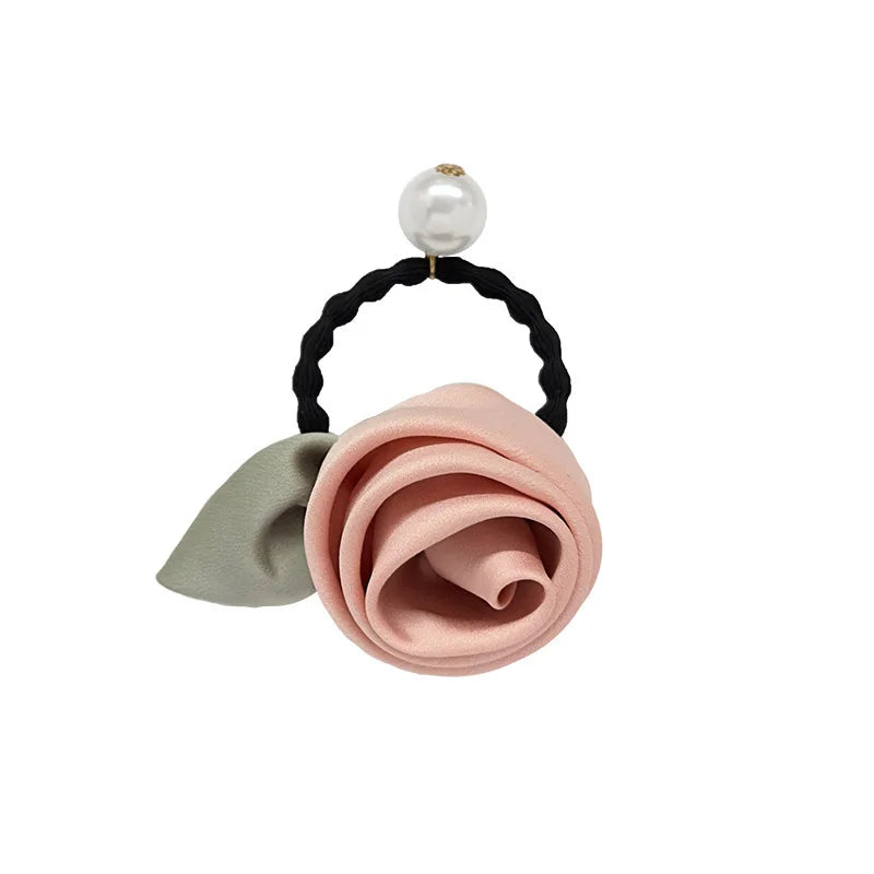 Women Elegant Silk Rose Flower Pearl Elastics Hair Band Beatiful Scrunchies Hair Ties Ladies Ponytail Holder Hair Accessories