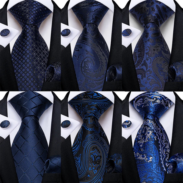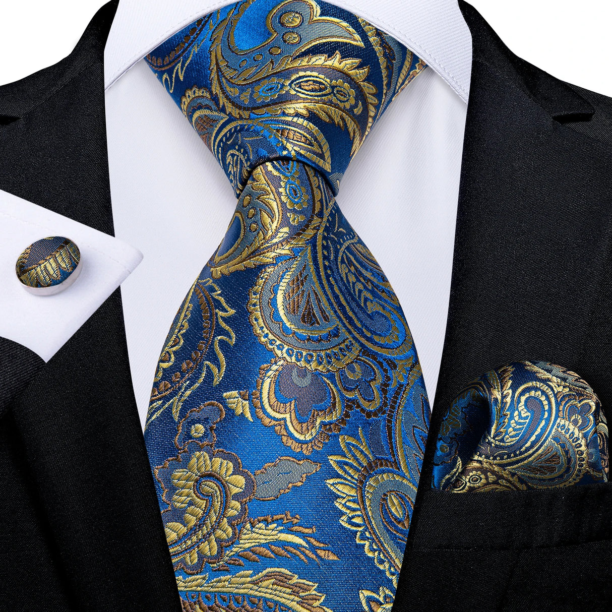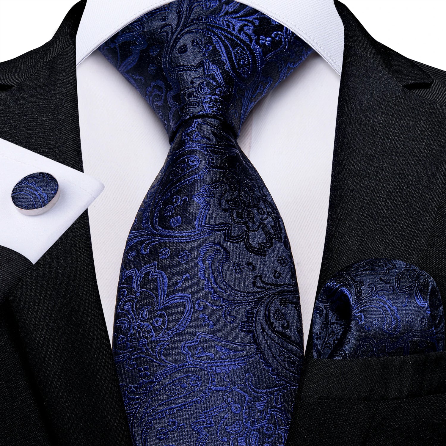 Elegant Blue Floral Paisley Men's 8cm Silk Tie Set with Pocket Square Cufflinks Business Suits Accessories Groom Wedding Cravat