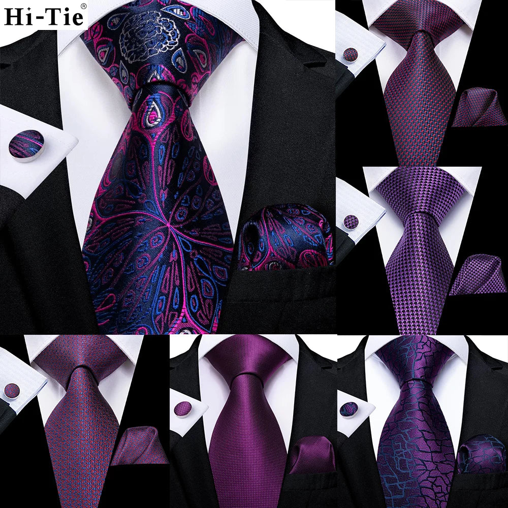 Hi-Tie Purple Solid Paisley Silk Wedding Tie for Men Novelty Design Handky cufflink Gift Men Tie Set Party Business Dropshipping