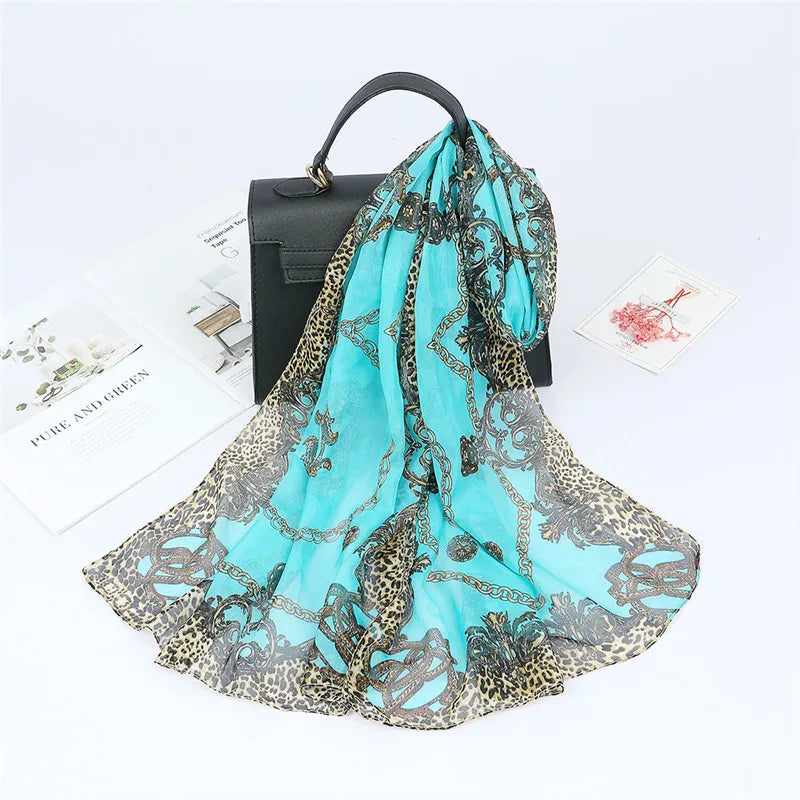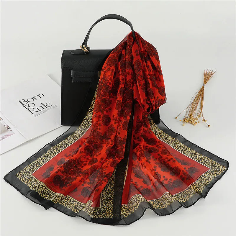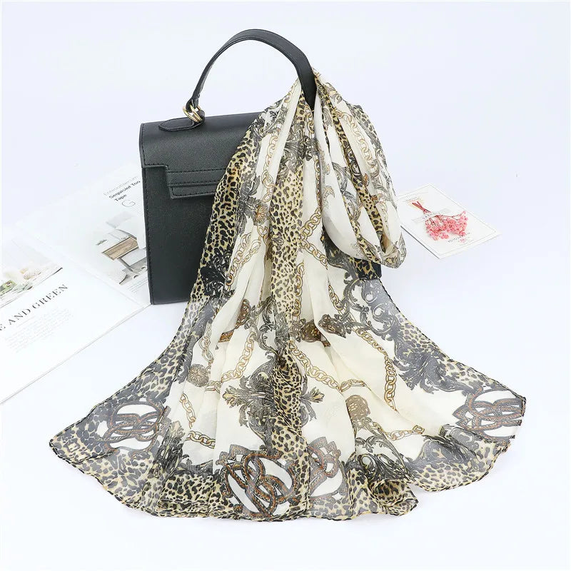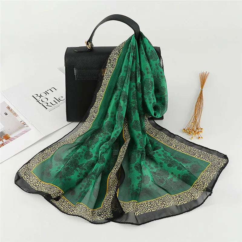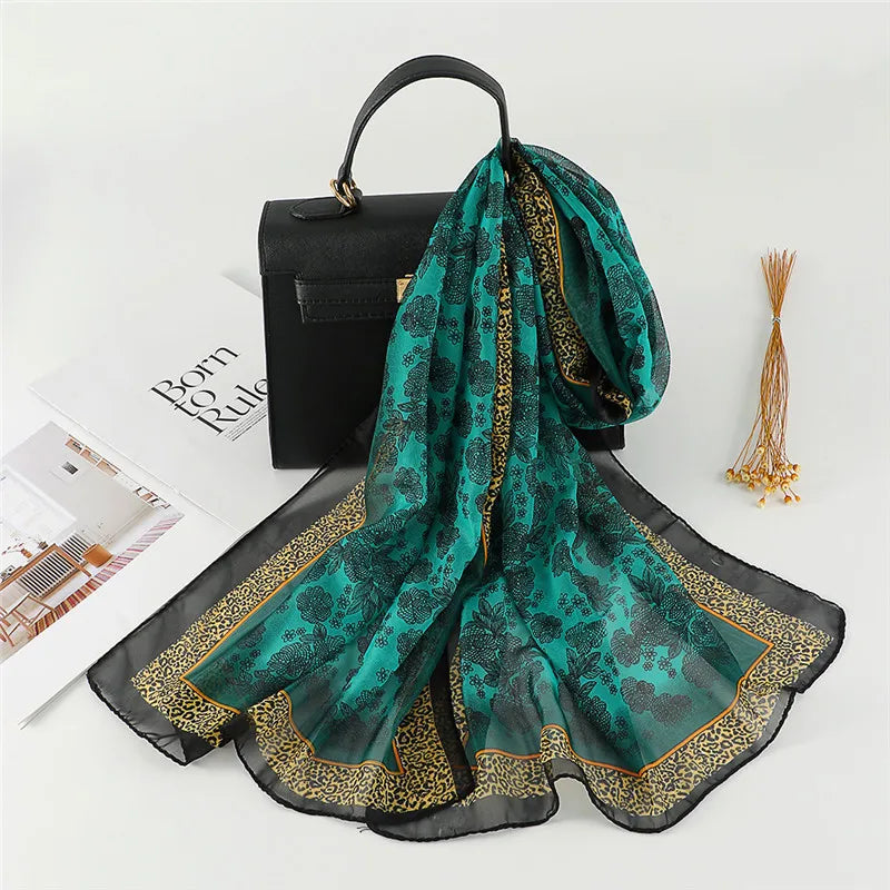 Spain Fashion Sexy Leopard Floral Patchwork Chiffon Silk Scarf Shawl Lady High Quality Wrap Beach Cover-ups Hijab Snood 150*50Cm
