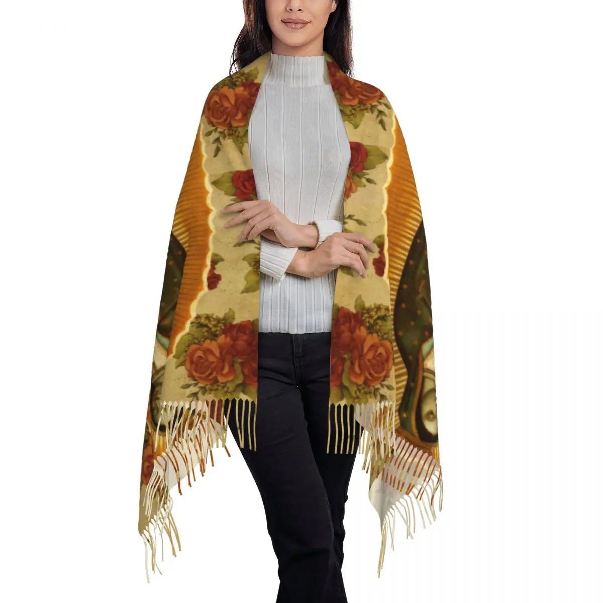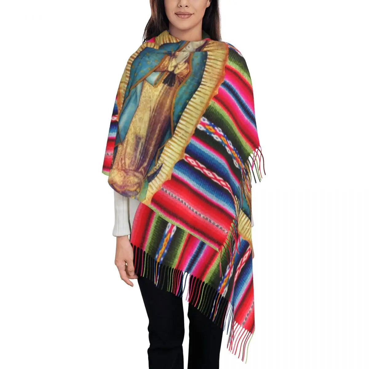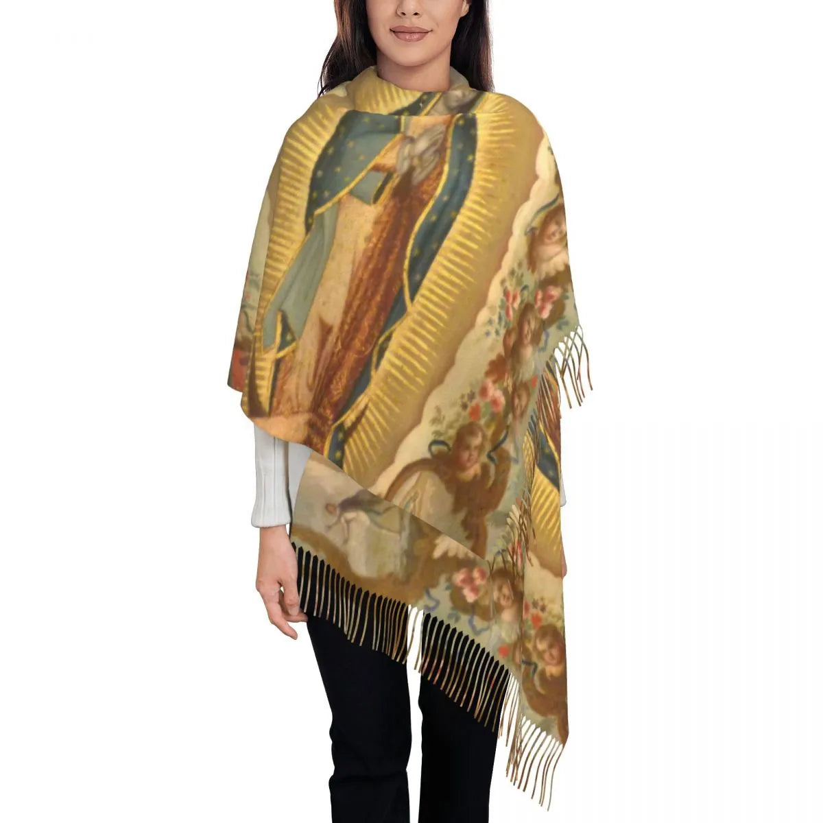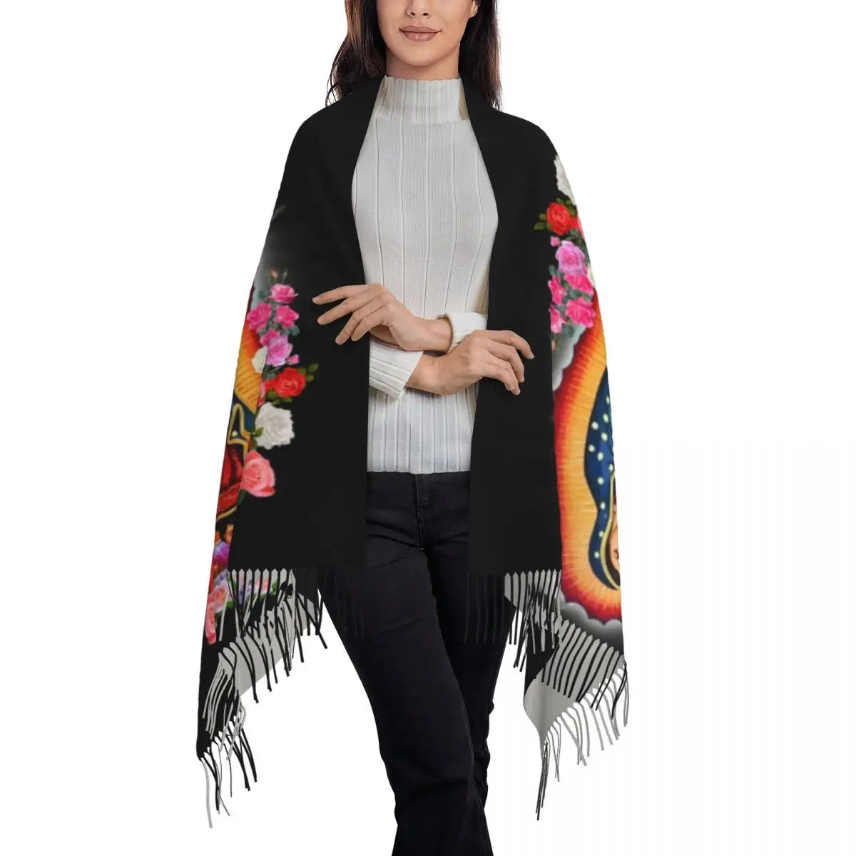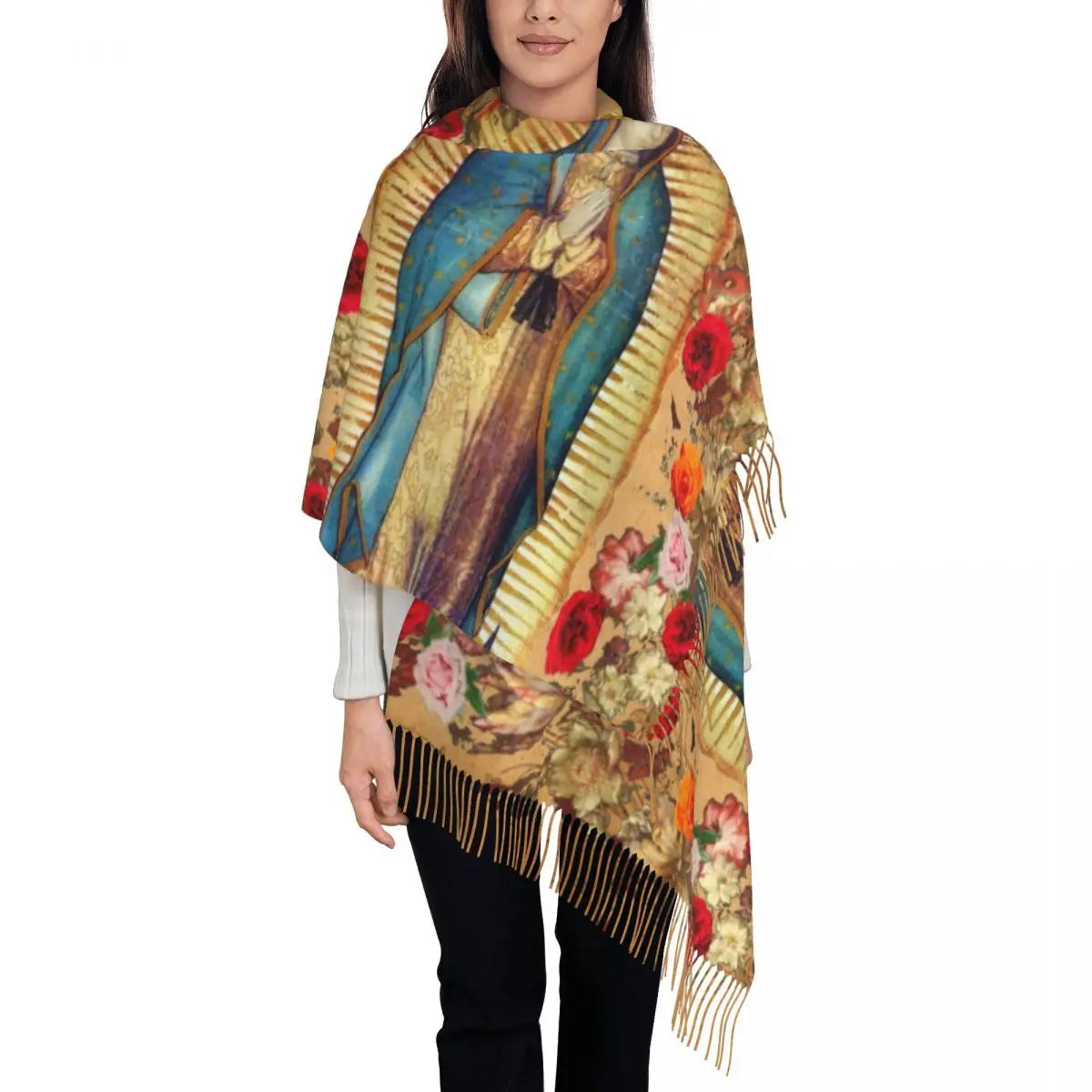 Stylish Our Lady Of Fatima Virgin Mary Tassel Scarf Women Winter Warm Shawl Wrap Ladies Portugal Rosary Catholic Scarves