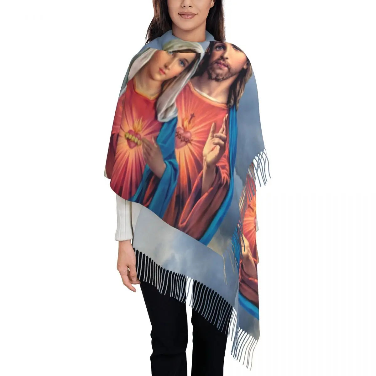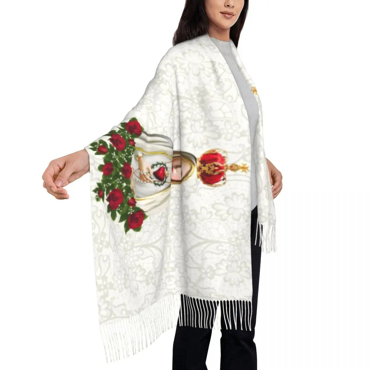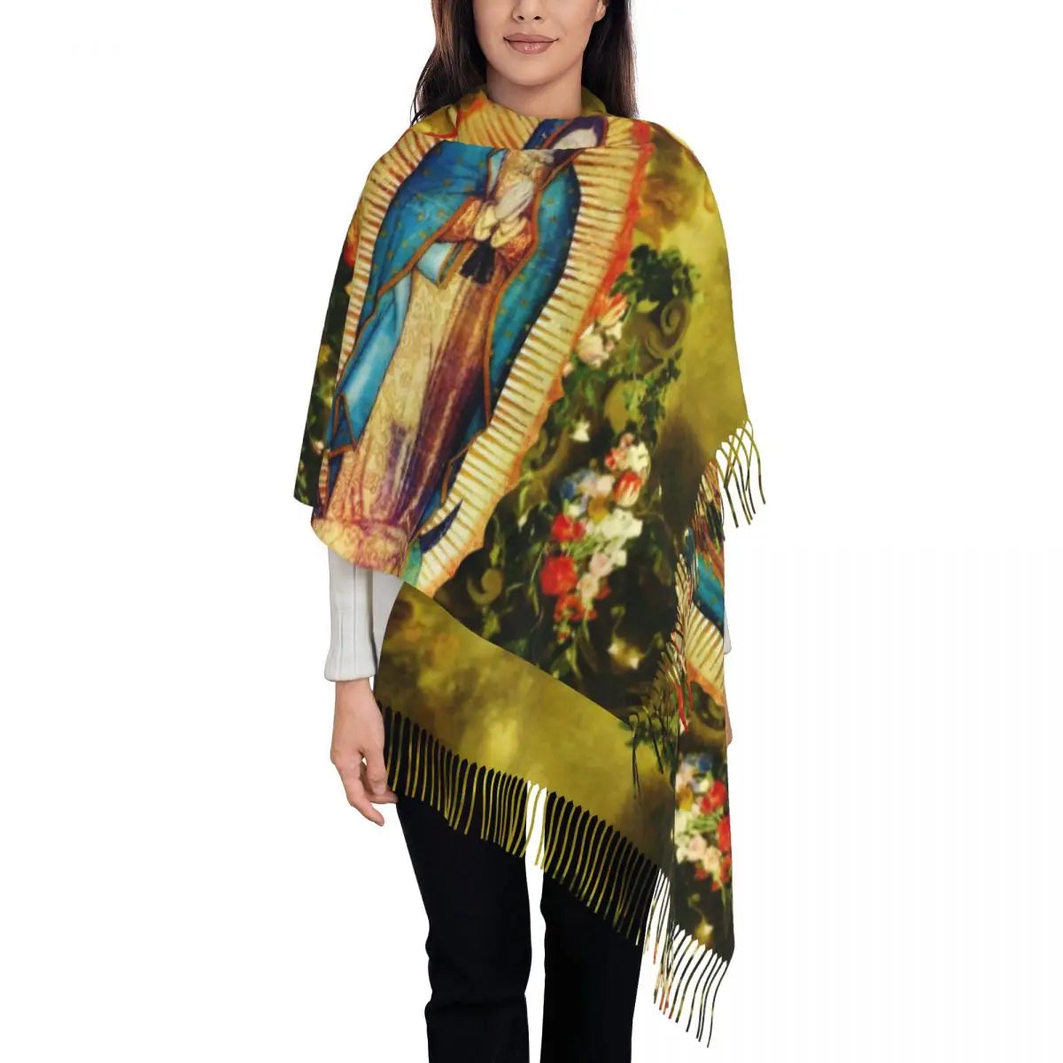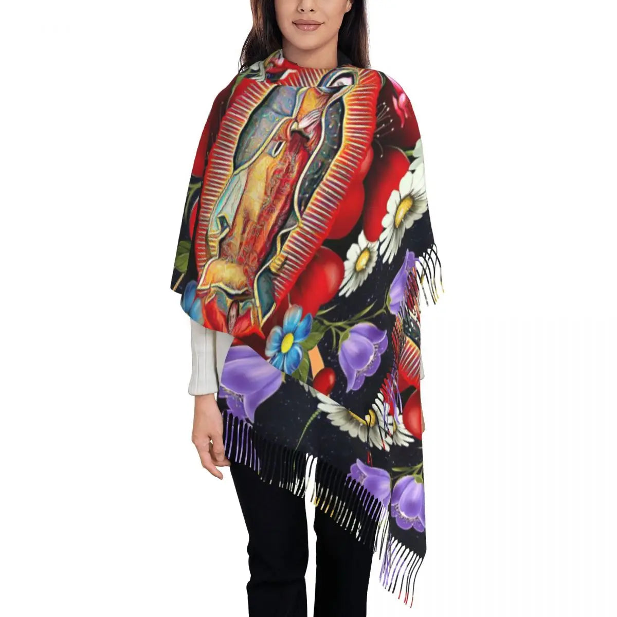 Stylish Our Lady Of Fatima Virgin Mary Tassel Scarf Women Winter Warm Shawl Wrap Ladies Portugal Rosary Catholic Scarves