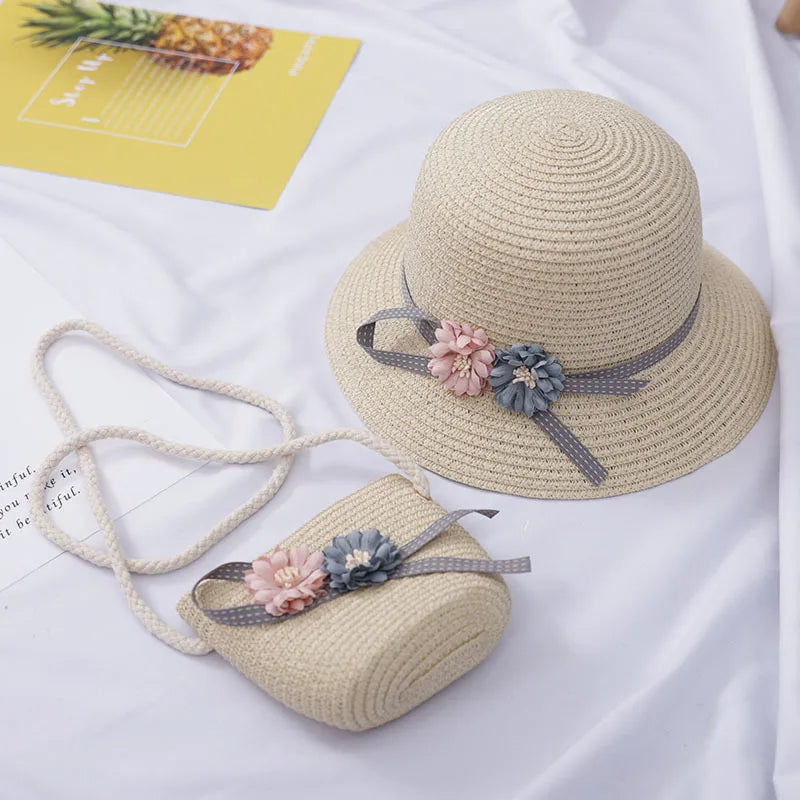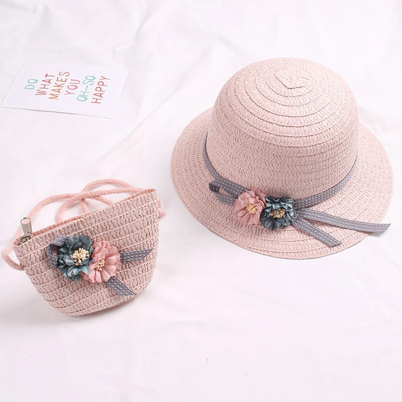 Summer Baby Straw Hat With Handbag Flower Breathable Beach Hat Bags Kids Hat Boy Girls Sun Visor UV protection panama Hat gorras