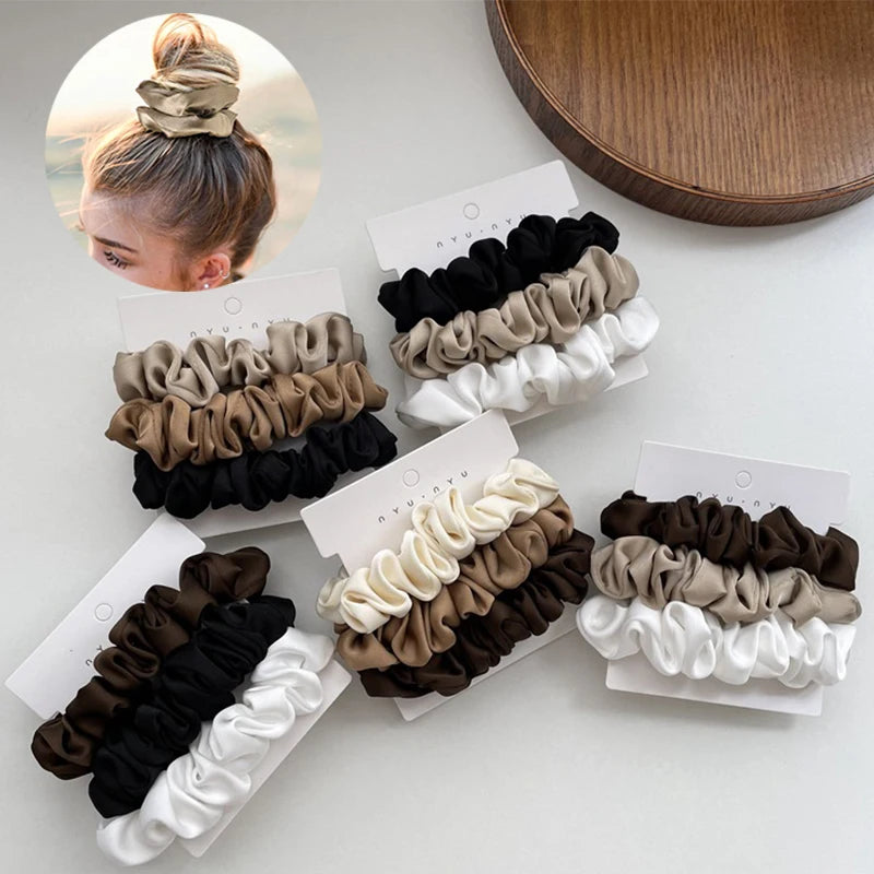 Silk Elastic Hair Bands Ponytail Holder Hair Tie Handmade White Black Coffee Hair Elastics 3Pcs Silky Satin Scrunchies Headwear