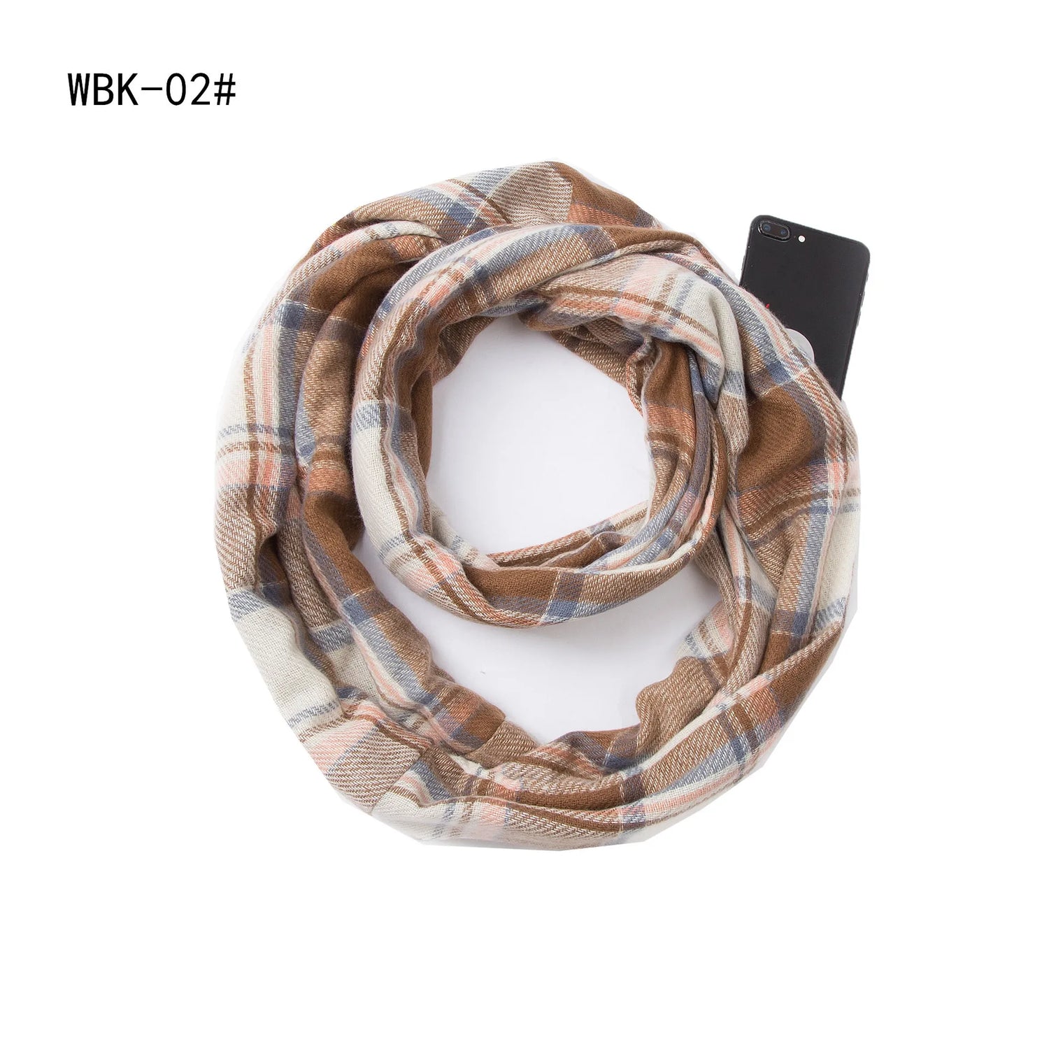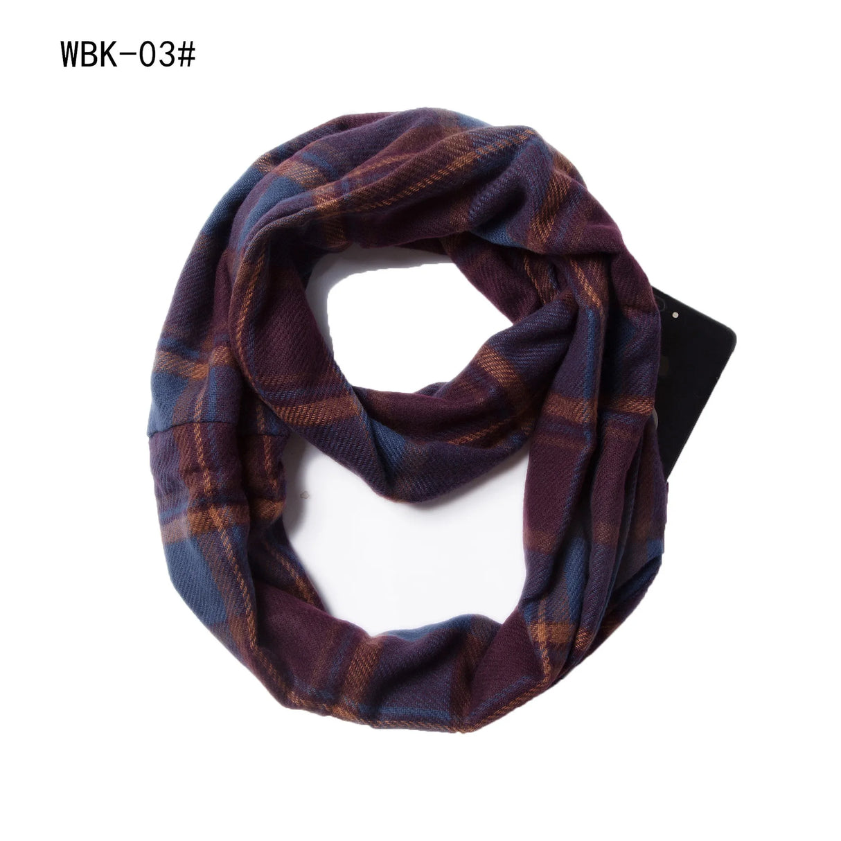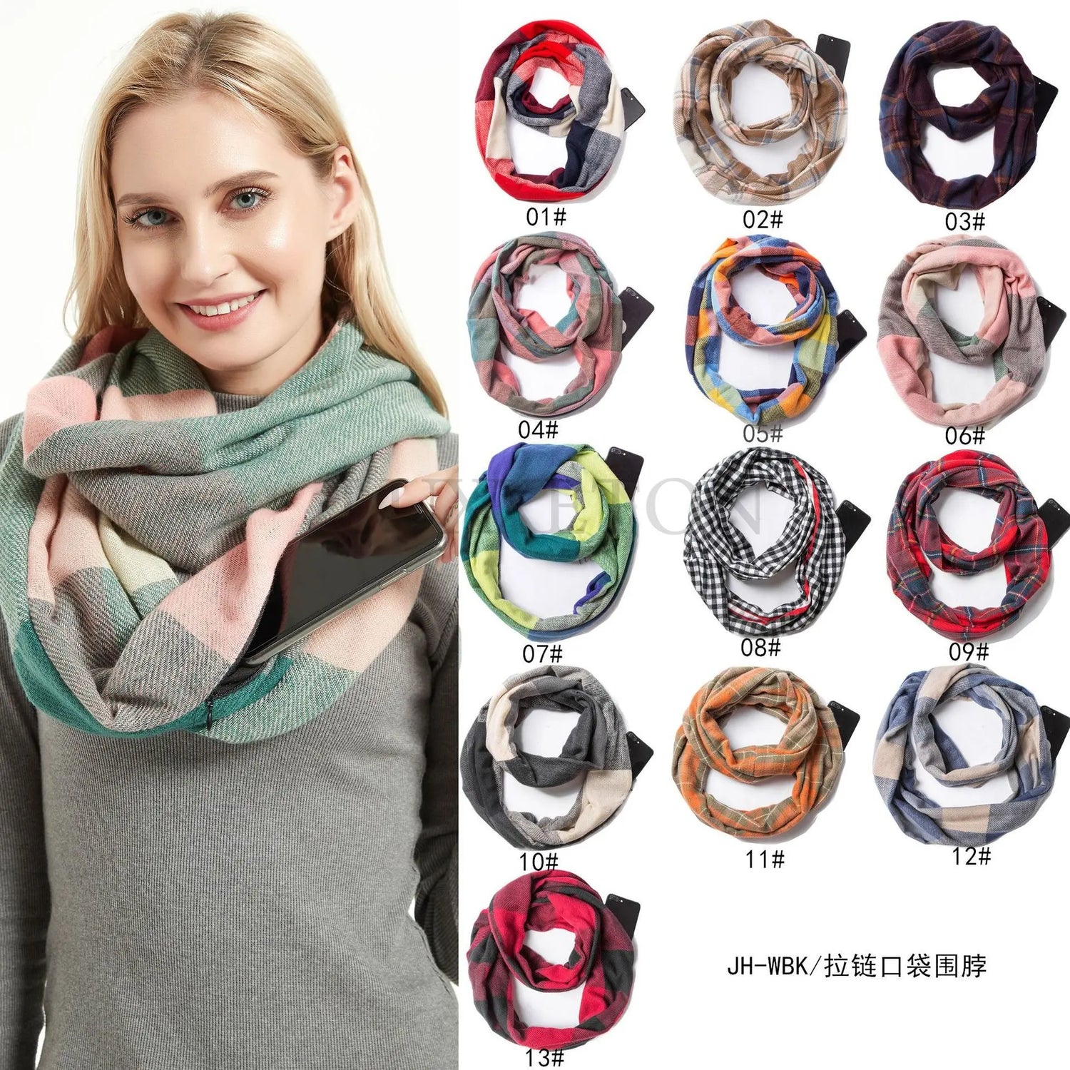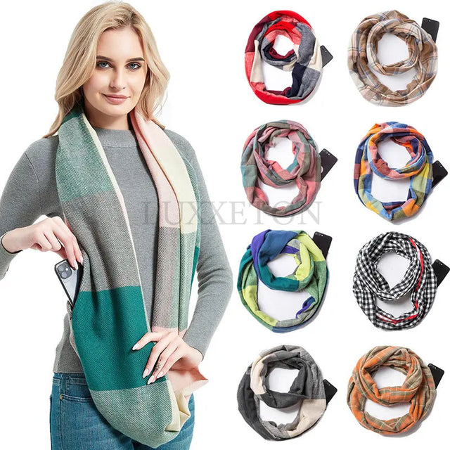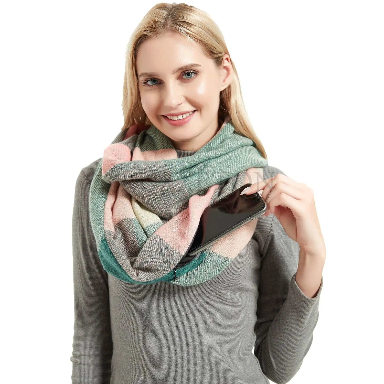 Damen Kaschmir-Schal mit Karomuster, warm, für den Winter, mit verstecktem Reißverschluss, Taschenschal, Damenhals, warm, Reise-Ringschal