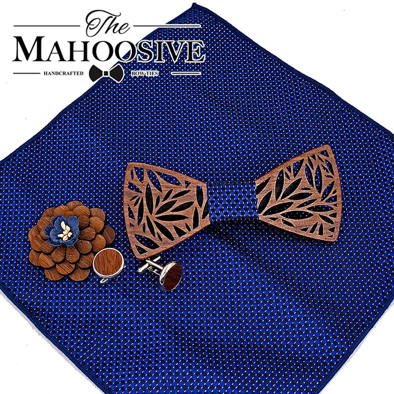 Conjunto de pajarita de madera y pañuelo para hombre, pajarita a cuadros de madera hueca tallada con diseño floral recortado y caja, corbatas novedosas de moda para hombre.