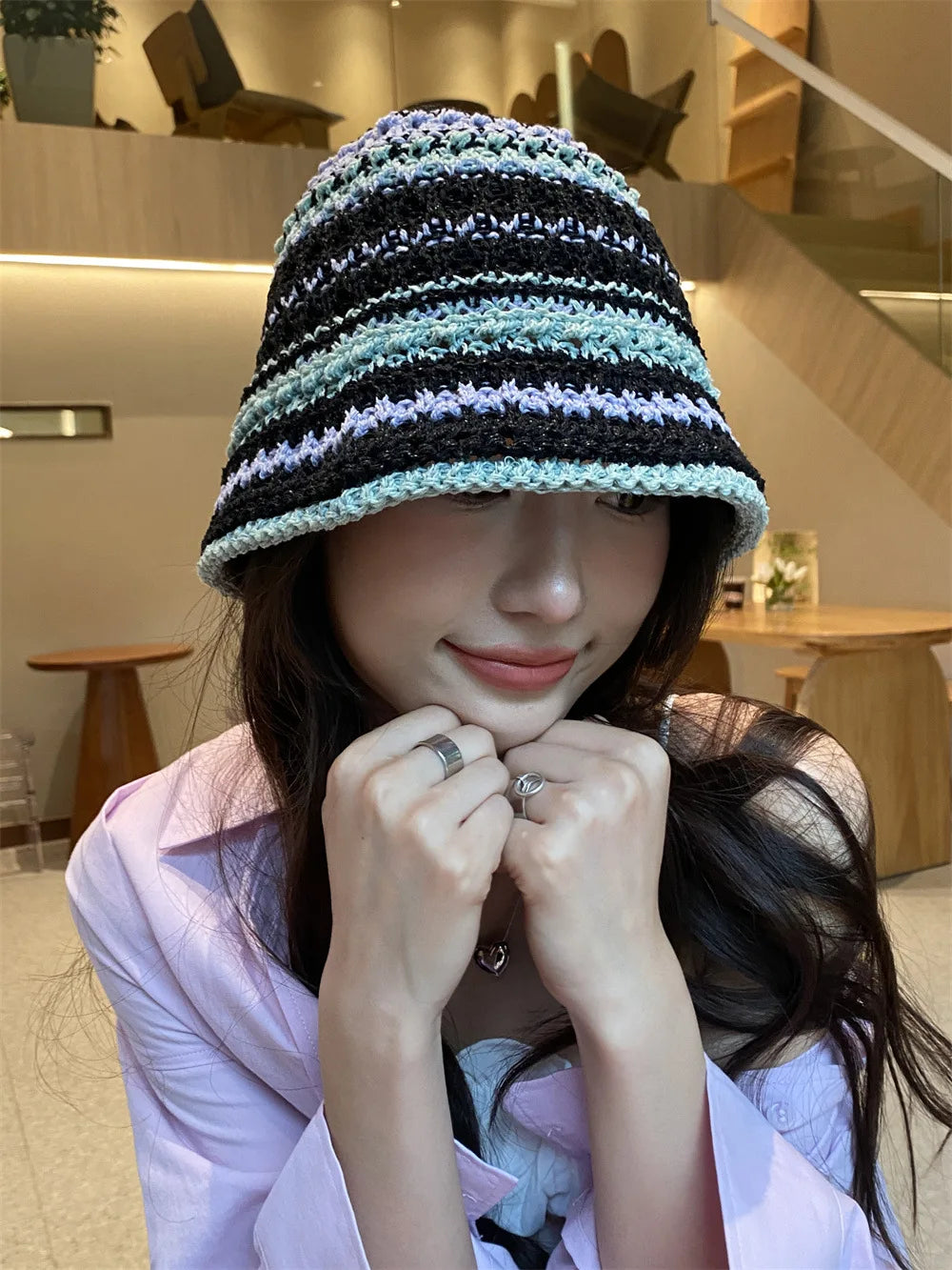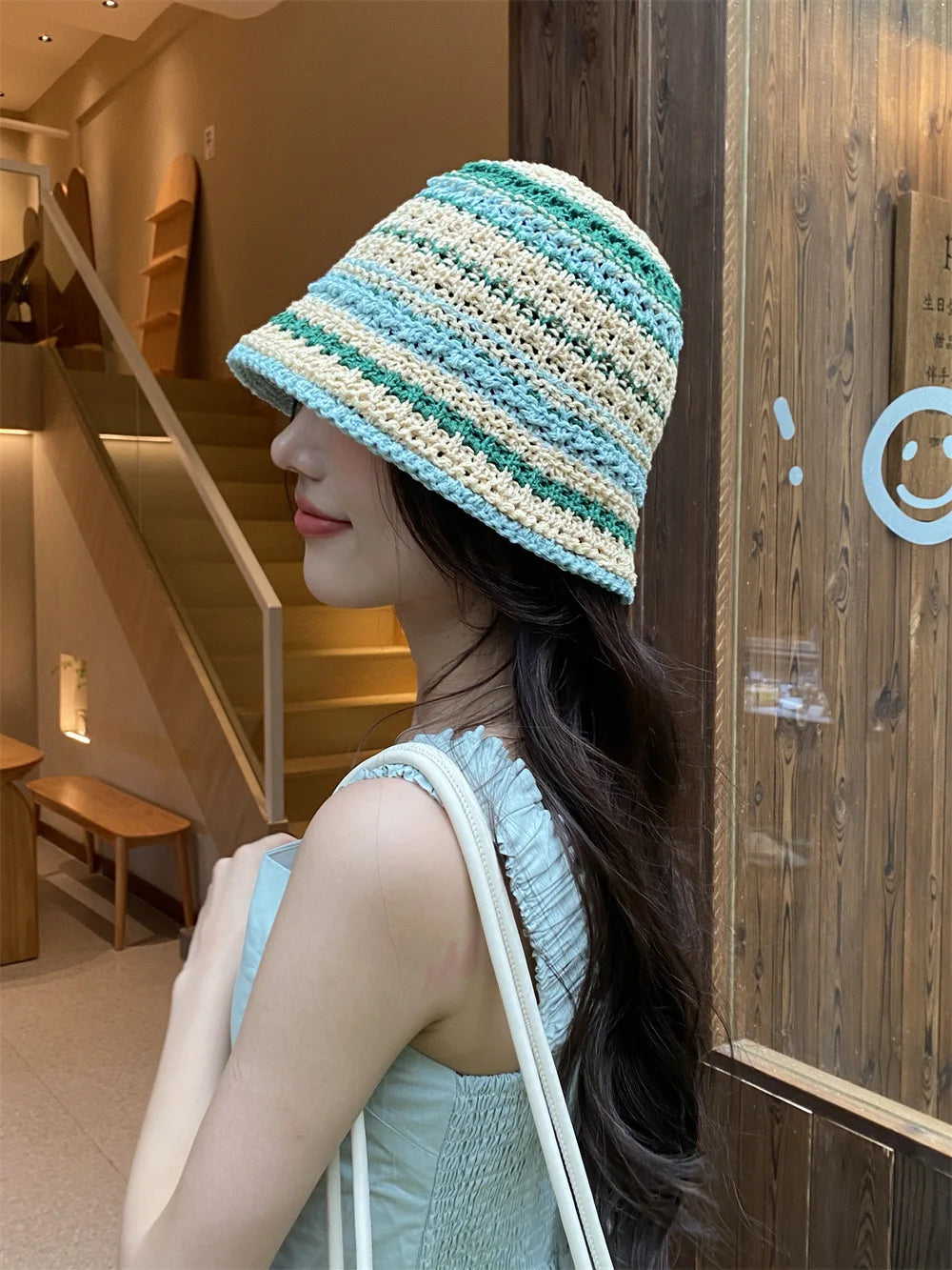 Chapeau de pêcheur coréen tricoté fin fait main, style bob à rayures, souple et polyvalent, idéal pour les voyages et le soleil, collection printemps et été