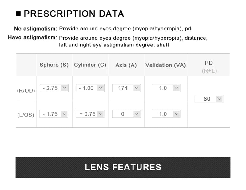 Have astigmatism: Provide around eyes degree (myopia/hyperopia), distance,