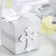 Faith-inspired, silver-and-white-patterned favor box with a budded cross intricately accented in silver on a horizontal, silver belly band, and a white-satin bow