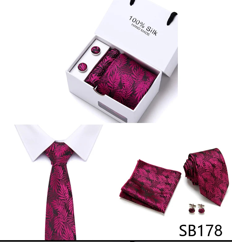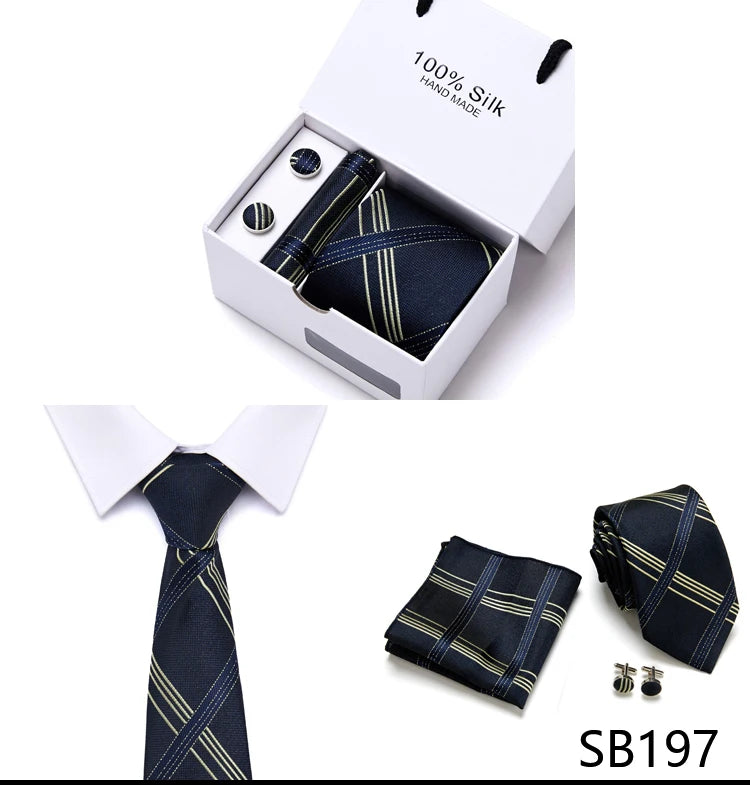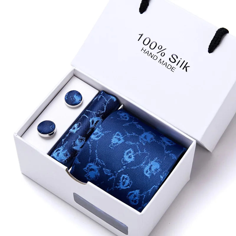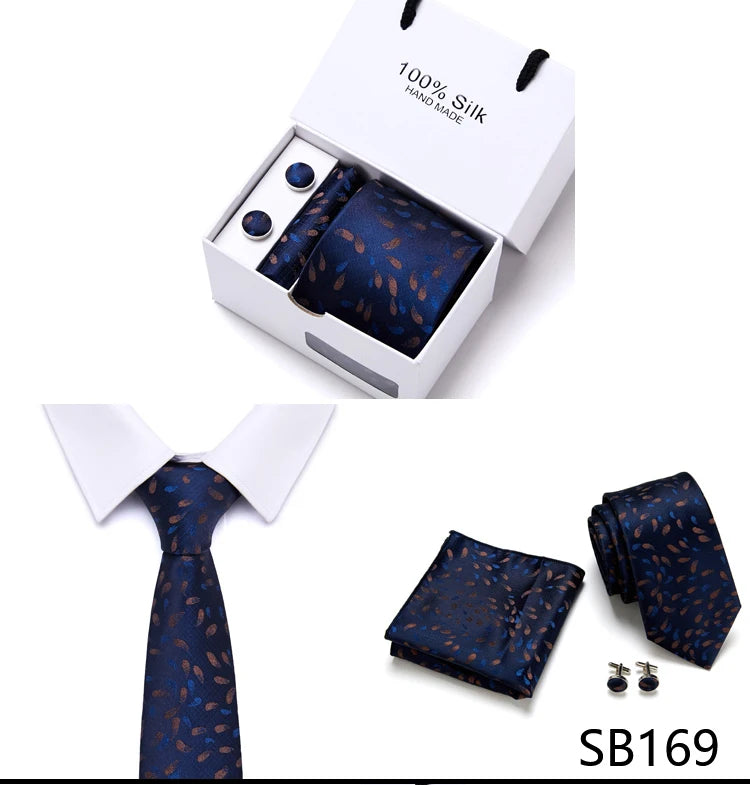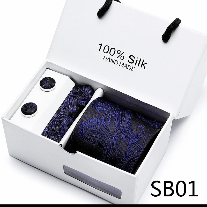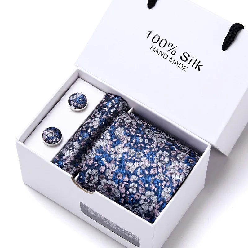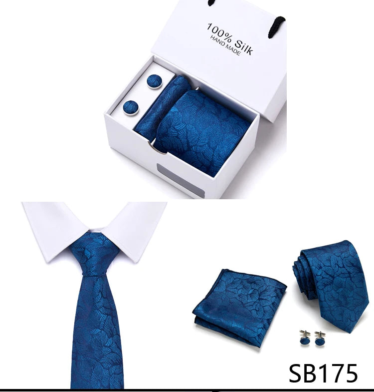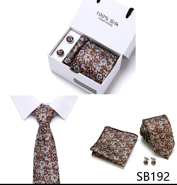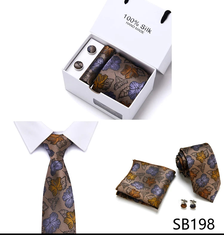 Brand 100% Silk Ties Gift box Office Men Classic Party Wedding striped 7.5cm Silk Wedding Floral Tie Necktie Handkerchief Set