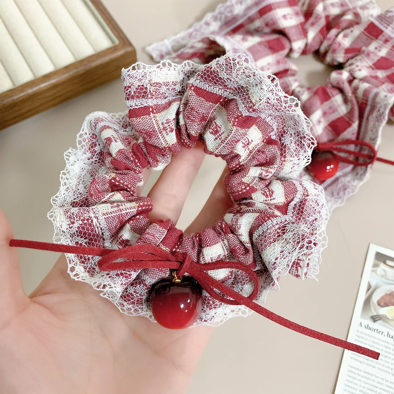 Large intestine headbands cherry hair tie square side ponytail headband red checkered hair accessory for women